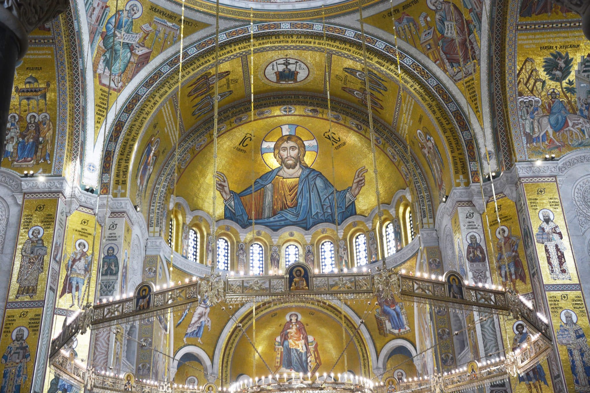 In front of the Edicule opens the space reserved to the Greek Orthodox, the Katholikon, occupying the center of the church where the Crusaders had built their Choir of the Canons. At the rear of the Katholikon is the iconostasis, divided into two by a patterned series of red marble arches and columns, behind which are located the traditional Greek Orthodox icons. On either side of the iconostasis are the two Patriarchal thrones reserved for visits of the Orthodox Patriarchs of Antioch and Jerusalem. To the rear of the iconostasis, beyond a sail vault, is the Crusader apse, whose ribbed ceiling is interspersed with windows that illuminate the church.