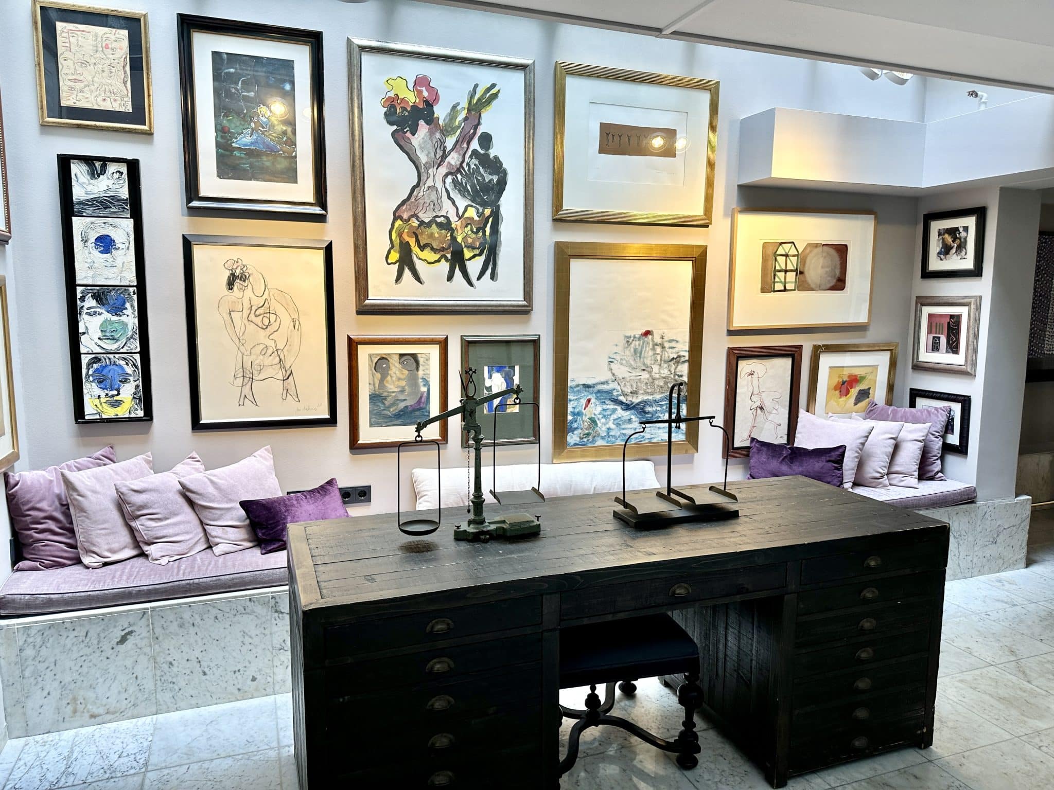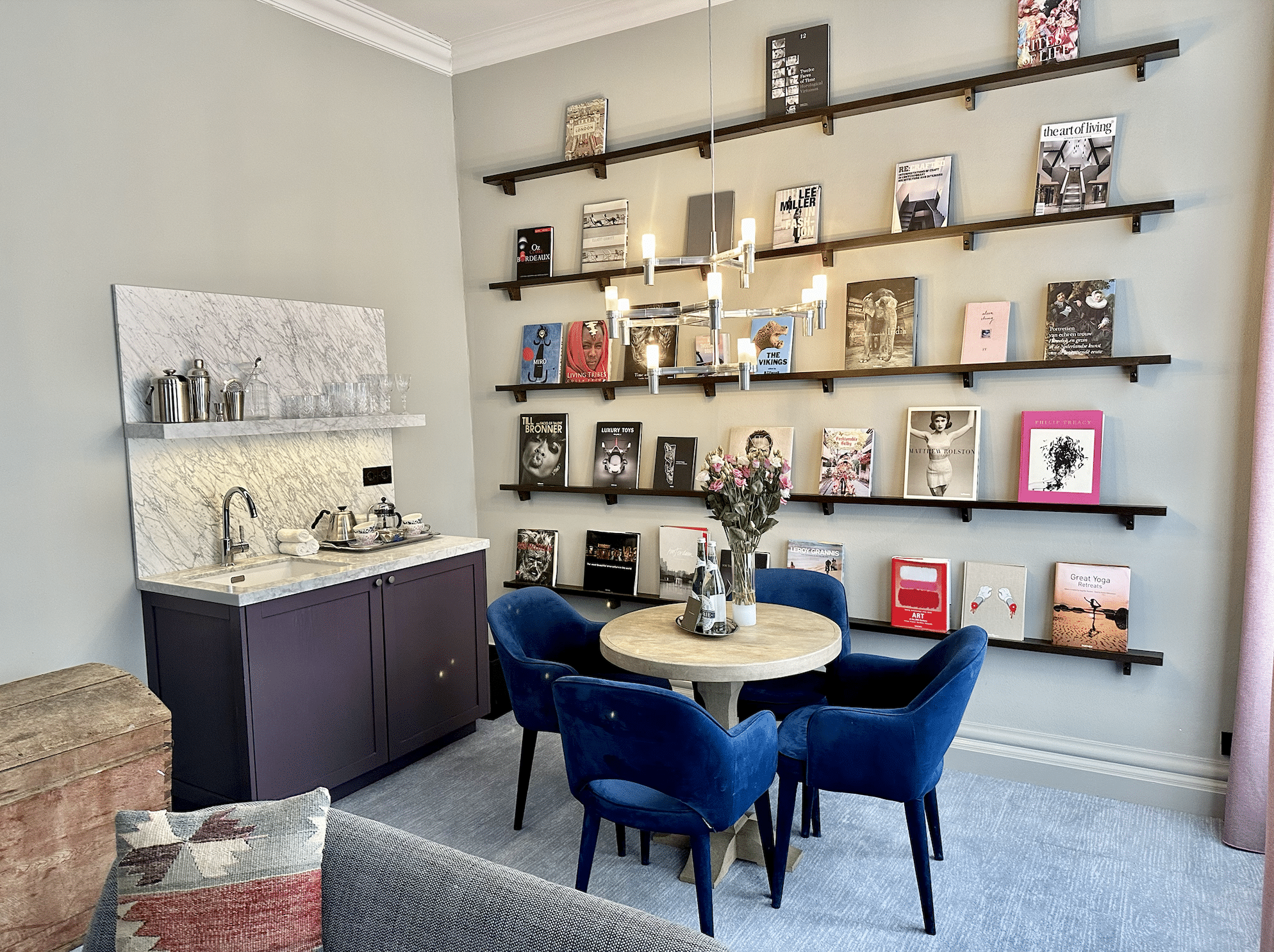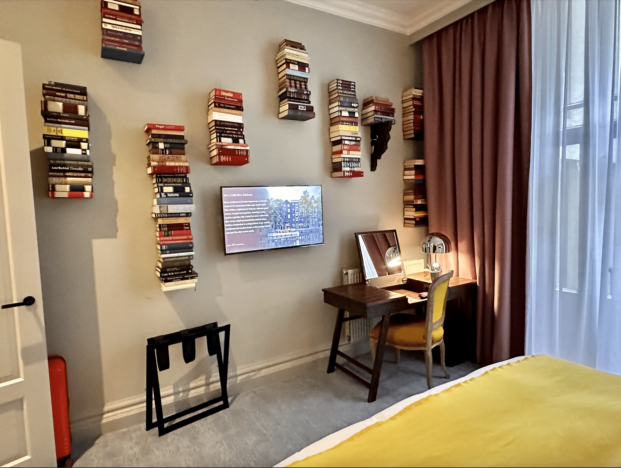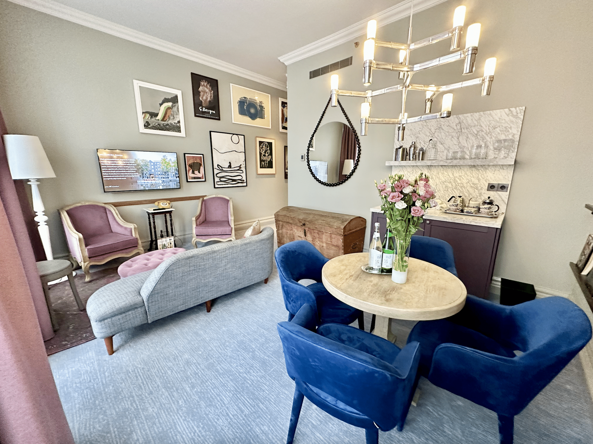 As I stepped into my Canal Suite, I was immediately struck by the breathtaking view of Amsterdam’s iconic canals through the large windows. The suite was a harmonious blend of modern comfort and historic charm, featuring high ceilings, period details, and a color palette that evoked the Dutch Golden Age. The spacious living area was elegantly furnished with plush seating, creating a cozy atmosphere that invited relaxation. One of my favorite touches? The walls in both the bedroom and living areas are covered in framed artwork and design books.