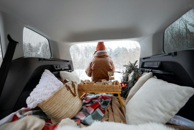 Your car can double as a sanctuary if you treat it that way. Before leaving, clear out clutter so you’re not brushing against empty coffee cups or receipts every time you reach for something. A clean, minimalist setup sets the tone for calm. Add a travel diffuser with cedarwood or bergamot essential oil to balance the stale winter air. A thermos of strong coffee or herbal tea within reach adds warmth and familiarity. It’s not just about surviving the drive—it’s about feeling human while you do it. A portable charger, noise-canceling headphones, and a small travel pillow are simple comforts that make long hauls much more forgiving.
