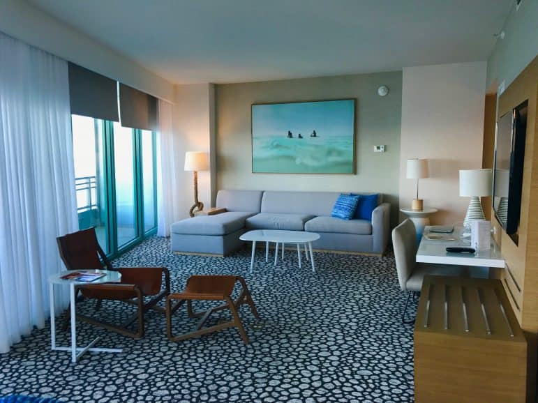 With 1000 rooms – including 96 suites – The Diplomat Beach Resort is the largest hotel in Broward County. Ā Our room was a corner Ocean Suite located on the 27th floor. It had a huge living room area with a desk, and a high top dining table for four. The floor to ceiling windows made the room very light and airy. Ā The bedroom was off the dining area with a comfy oversize love seat and a walk-in closet.